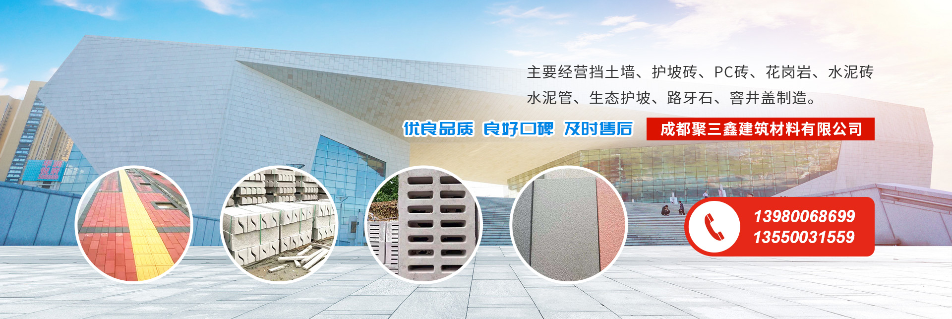 成都聚三鑫建筑材料有限公司公司成立2018年,位于四川省崇州市,占地15600平方米,我們擁有固定資產達3000萬元,交通十分便利。成立以來一直以優質的產品、良好的口碑、及時的售后獲得了市場的高度認可。在工廠后期發展壯大的時間里,我們不忘初心,始終為客戶提供高品質產品和技術支持、健全的售后服務,我工廠主要經營擋土墻、護坡磚、pc磚、花崗巖、水泥磚、水泥管、生態護坡、路牙石、窨井蓋制造。(依法須經批準的項目,經相關部門批準后方可開展經營活動),我們有好的產品和專業的銷售和技術團隊,創建以來本秉著“誠信,務實
